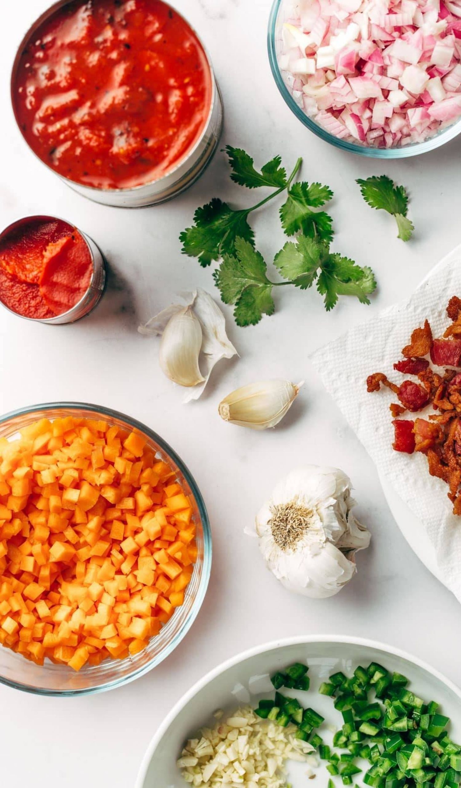 This is the BEST Sunday Chili! Beef, bacon, tomatoes, chopped veggies, beans, and spices – it’s a cozy weather weekend essential!